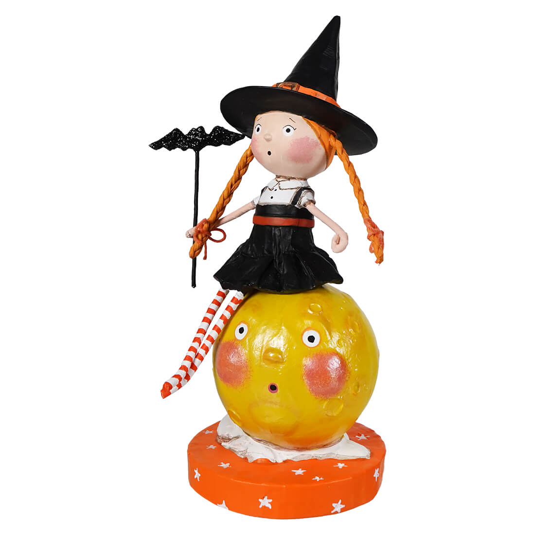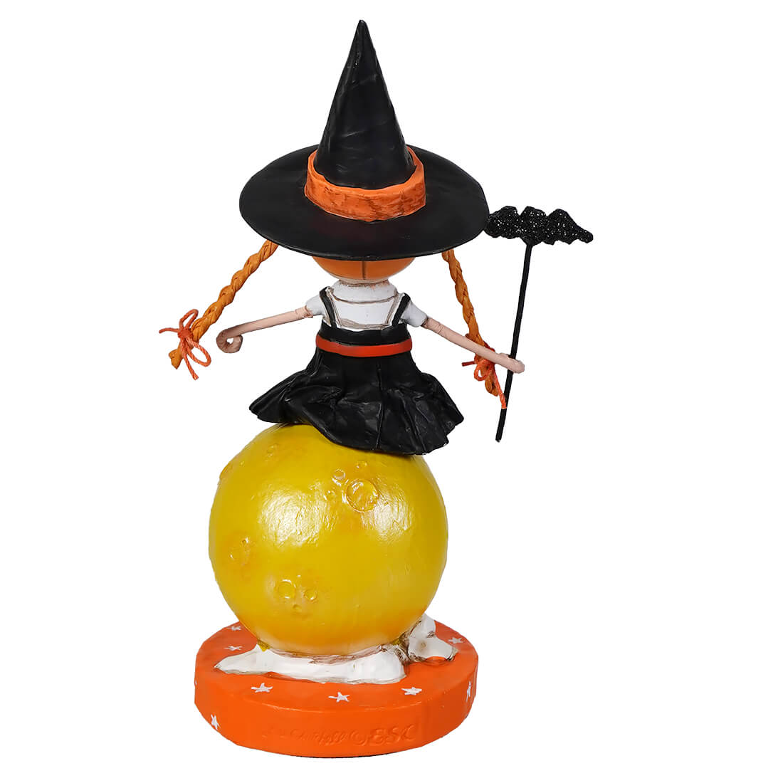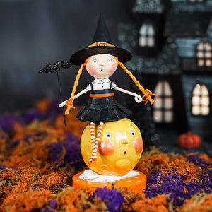 Hold onto your broomsticks—there’s Mischief on the Moon! This charming Lori Mitchell figure captures a young witch who’s ditched her usual midnight ride for a front-row seat on the face of the moon itself. Dressed in a classic black dress, striped stockings, and a pointed hat, she perches atop a big, beaming crescent moon, clearly up to something. With a twinkle in her eye and a little smirk on her face, you just know she’s brewing up some playful trouble.