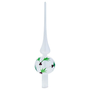The topper is a testament to skilled craftsmanship, with its delicate glass construction catching the soft twinkle of Christmas lights. Its sleek, elongated form draws the eye upward, culminating in a celebration of the season at the very top of your tree. The bulbous center is adorned with hand-painted mistletoe leaves and berries, a classic yuletide emblem that evokes feelings of warmth and togetherness.