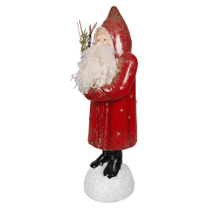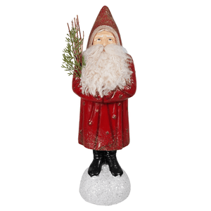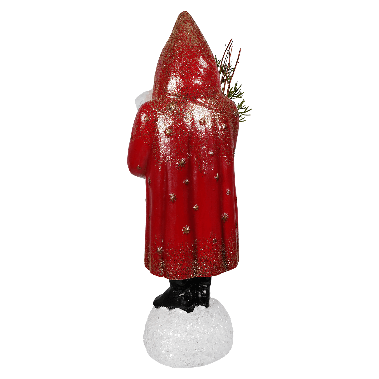 Bring the magic of old-world Christmas into your home with Bethany Lowe's Nostalgic Red Belsnickle Santa. Inspired by traditional German folklore, this hand-painted holiday figure is dressed in a deep red coat sprinkled with metallic gold stars and shimmering glitter accents along the hood, shoulders, and hem.