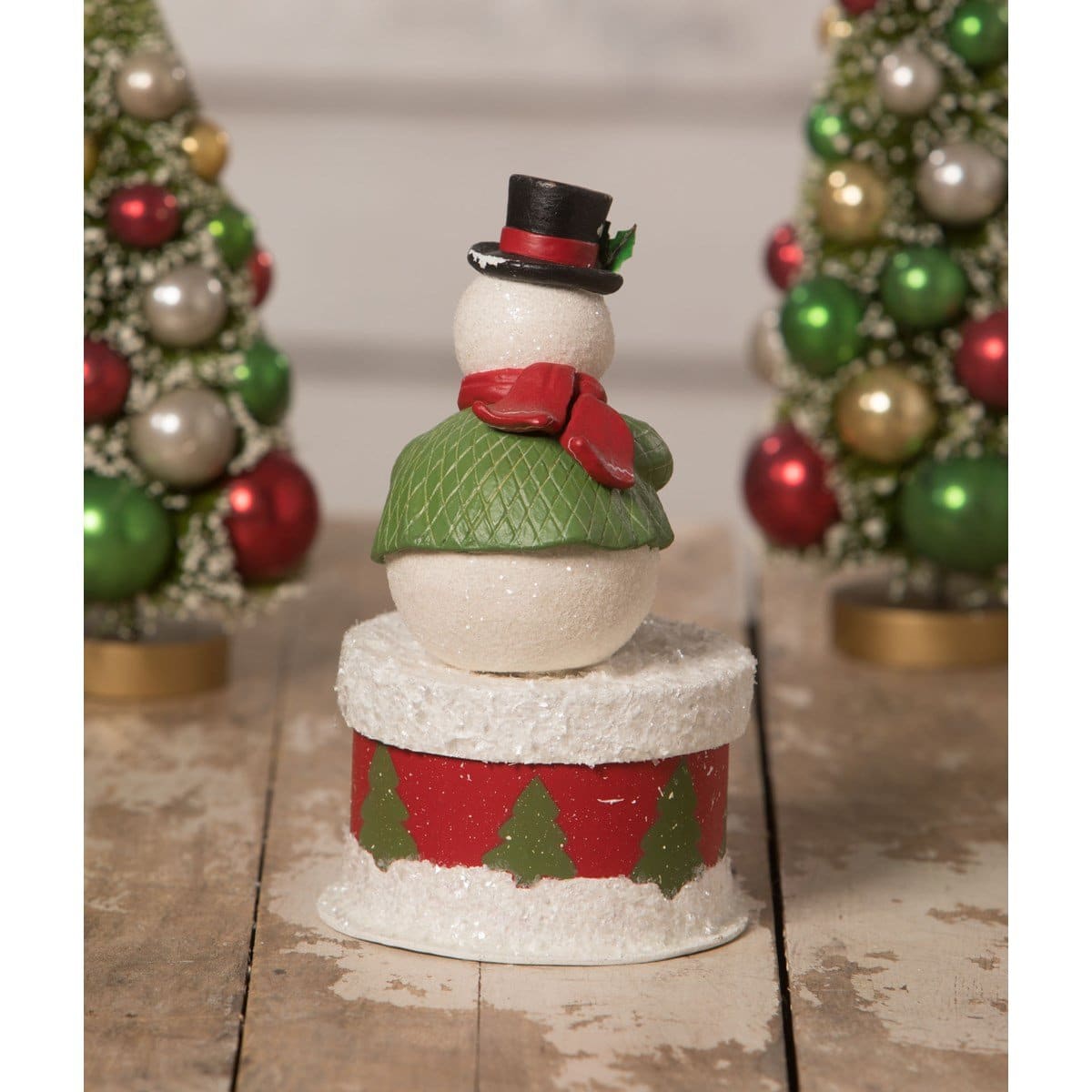 This old friend has got a little secret... Don't you just want to know what you might find inside the box? This cheerful snowman in a festive top hat, red scarf and quilted green coat is decorating a small bottle brush tree while also serving as the lid to a small box.