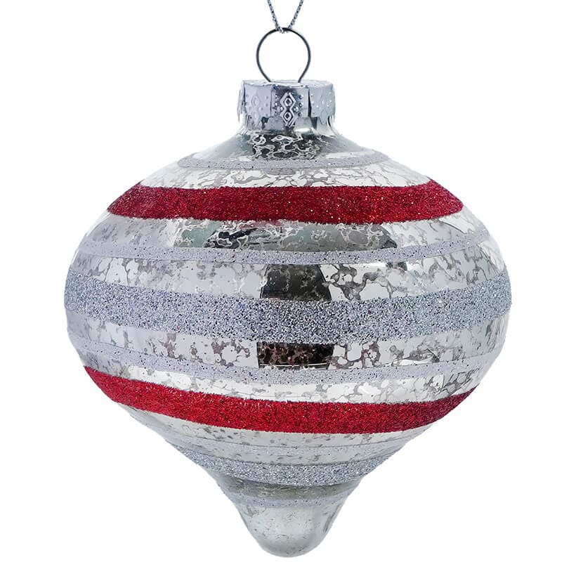 Measuring 4.5x3.75 inches, this ornament strikes the perfect balance between being stylish and seamlessly blending with your other decorations. The classic onion shape and mottled mercury glass, combined with the red and silver glitter stripes infuses a modern twist, creating a harmonious fusion of timeless and contemporary aesthetics. Hang this delightful ornament on your Christmas tree, incorporate it into garlands, or display it in a decorative bowl to add a pop of festive flair to your home.