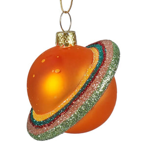 Turn your holiday tree into a stellar celebration with the Orange Saturn Ornament! This striking 2.5-inch decoration is perfect for adding a cosmic flair to your festive décor. Crafted from glass and adorned with glitter, the ornament radiates a warm orange glow that captures the fiery spirit of the gas giant.