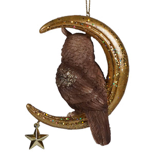 Made from resin, the ornament features a carefully sculpted owl with layered feathers, a white chest, and a deep brown body. Its wings are coated with fine gold glitter that reflects light without drowning out the detail underneath. The owl's gaze is direct, with black and gold eyes framed by subtle facial markings. It's perched on a crescent moon finished in metallic gold, dotted with silver stars and multi-colored confetti glitter that gives it a scattered, cosmic feel.