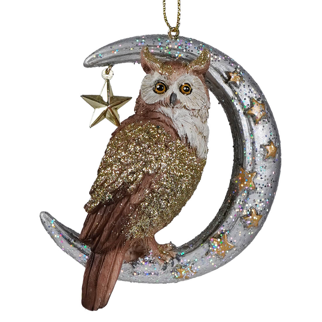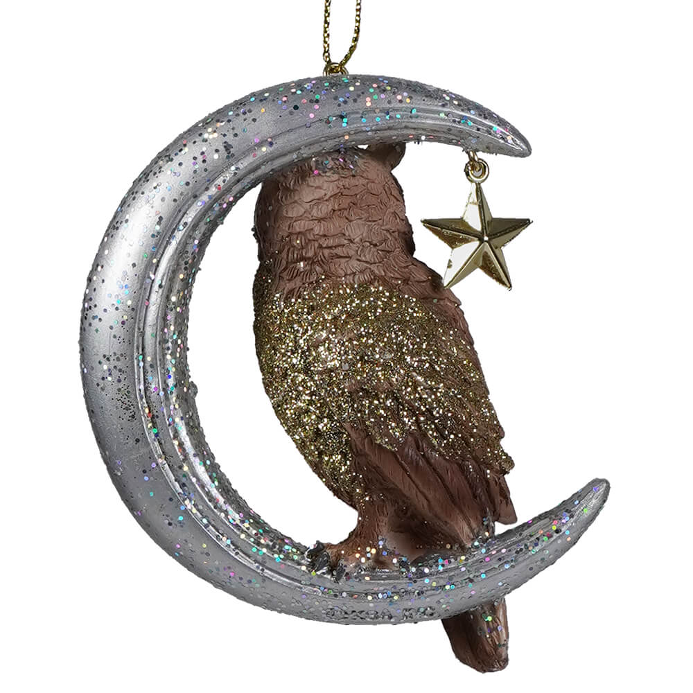 The silver moon curves around the owl’s body, covered in scattered gold stars and flecks of multi-colored glitter that reflect light without overpowering the sculpted form. Hanging from the upper arc of the moon is a gold star charm, attached by a small loop, adding a slight bit of movement when the ornament sways.