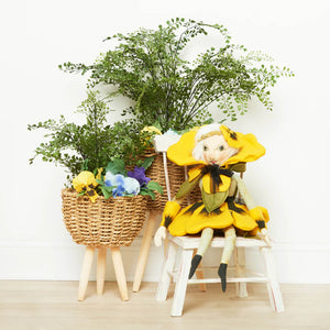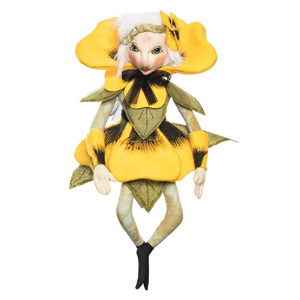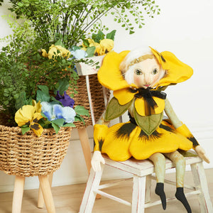 Capturing the essence of a vibrant spring garden it's Paulina Pansy . This 21-inch stuffed fabric doll is intricately designed, her body mimicking the form and colors of a bright yellow pansy flower. Her head is equipped with a wide, soft petal collar that is brightly painted to imitate the vibrant petals of a yellow pansy, making her an optimistic complement to any floral-themed spring wardrobe.