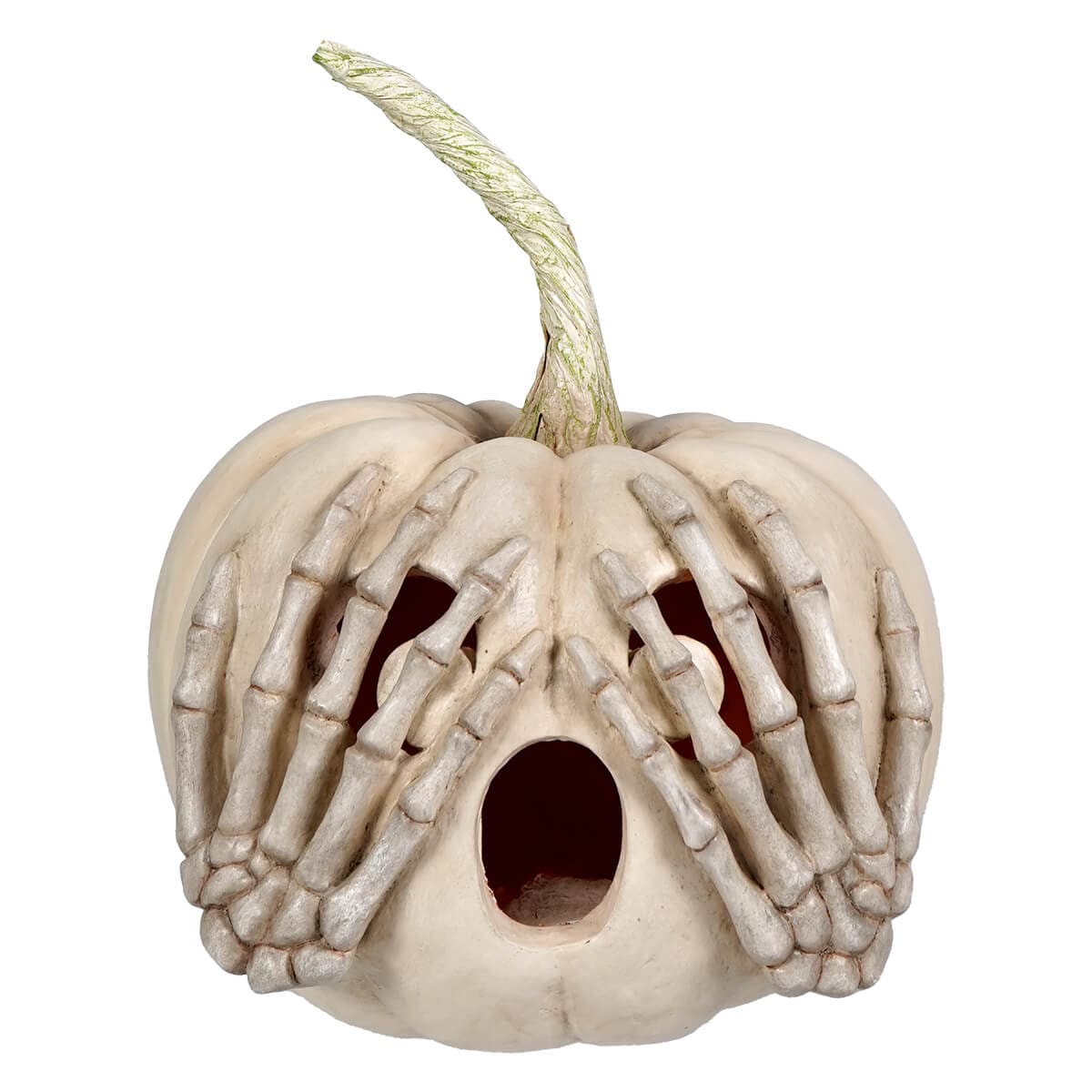 What's that over its eyes? Oh, just skeleton hands, because this pumpkin isn't just surprised; it's downright tickled by the Halloween shenanigans. It's like the pumpkin version of "I see you, but do you see me?" – a game that's more thrilling than a midnight ghost hunt.