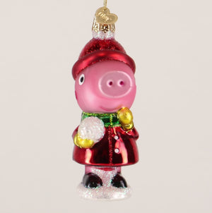 Bundled up in her bright red coat and matching hat, Peppa looks ready for a day of snowball fights and giggles. A cheerful green scarf wraps around her neck, while tiny golden mittens and softly glittered snow add just the right amount of sparkle. The glossy finish and shimmering accents give this glass and glitter ornament a lively glow, especially when it catches the light on your tree.