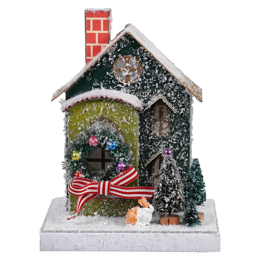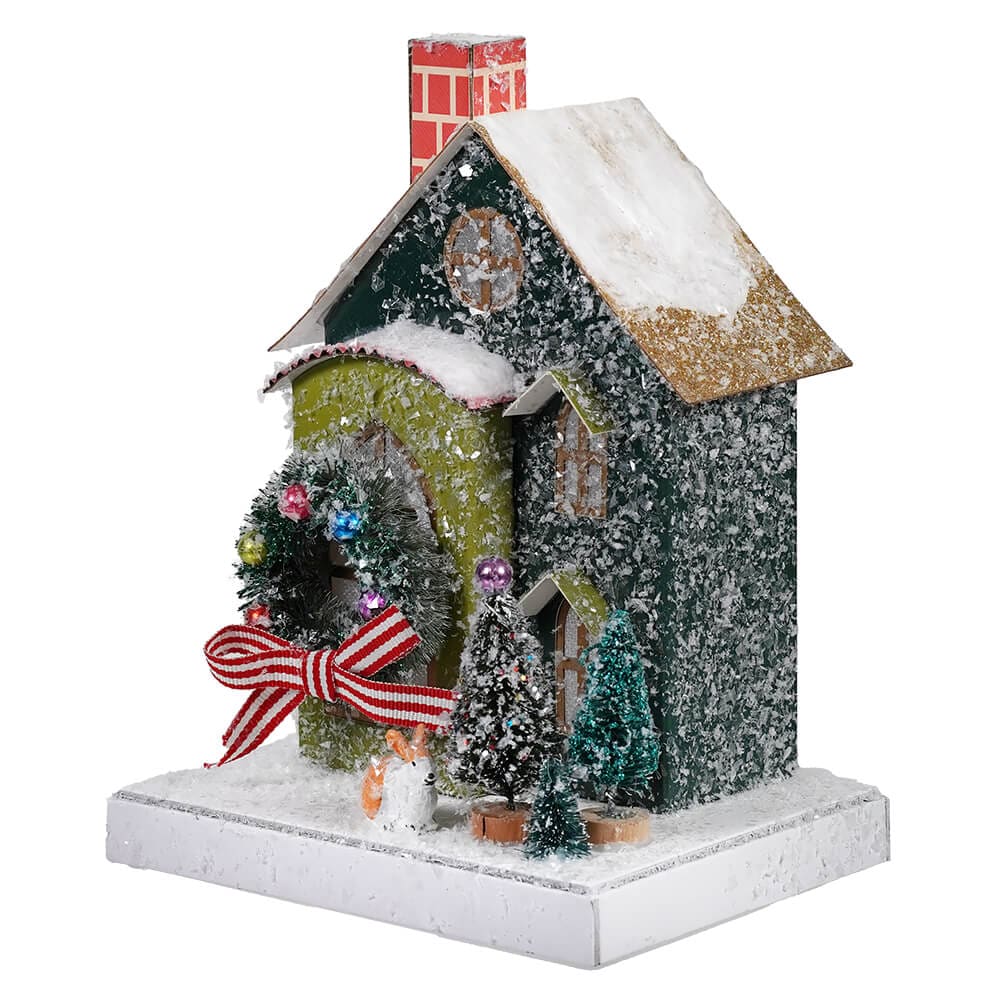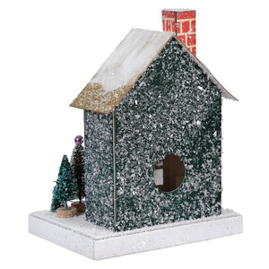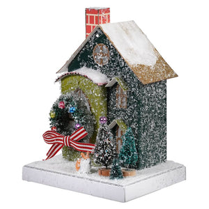 This pint-sized domicile is more than just a decoration; it's a testament to festive living, with two shades of green that would make any Grinch reconsider his stance. Topped off with a red brick chimney and a generous dusting of fake snow, it's the cozy abode that Santa himself would be tempted to cozy up in.