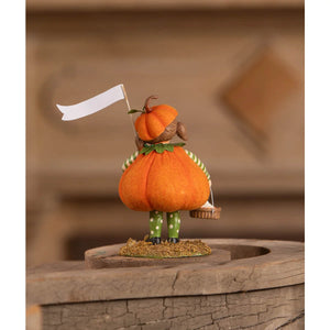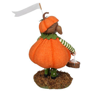 Petunia Pumpkin Pie brings a playful autumn look with her pumpkin-themed outfit and cheerful face. This hand-painted figurine stands 6.25 inches tall and wears a big round, flocked pumpkin costume with fabric leaves around its collar. A pumpkin cap sits on her head, complete with a tiny stem, adding to the seasonal theme.