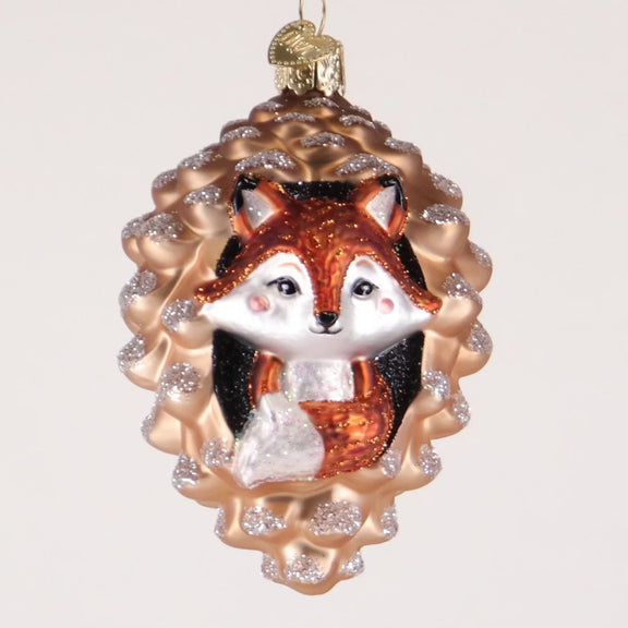 Tucked inside a snowy pinecone, the Piney Fox ornament by Old World Christmas feels like a tiny woodland story brought to life. This beautifully crafted glass and glitter ornament features a sweet fox nestled within the textured pinecone, peeking out with a calm, curious expression that instantly draws you in.