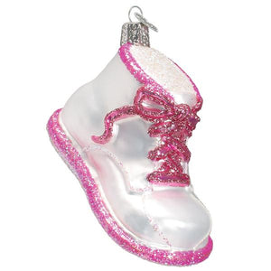 Text on Old World hang tag: The arrival of a baby brings many wonderful firsts – first tooth, first word, and of course that all important first step. We all treasure the memories of these milestones in their lives. This pink and white glass baby shoe ornament makes a wonderful keepsake to commemorate a baby girl’s first step or first Christmas.