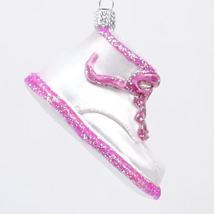 Tiny laces, twinkling sparkles, and the softest hues of pink—this ornament is a heartwarming reminder of baby's firsts. Picture this delicate pink baby shoe ornament hanging on the Christmas tree, glittering softly amidst the festive lights, a sweet memento of tiny feet taking their very first steps. Measuring a charming 4.25 inches, it captures the wonder of those early milestones.