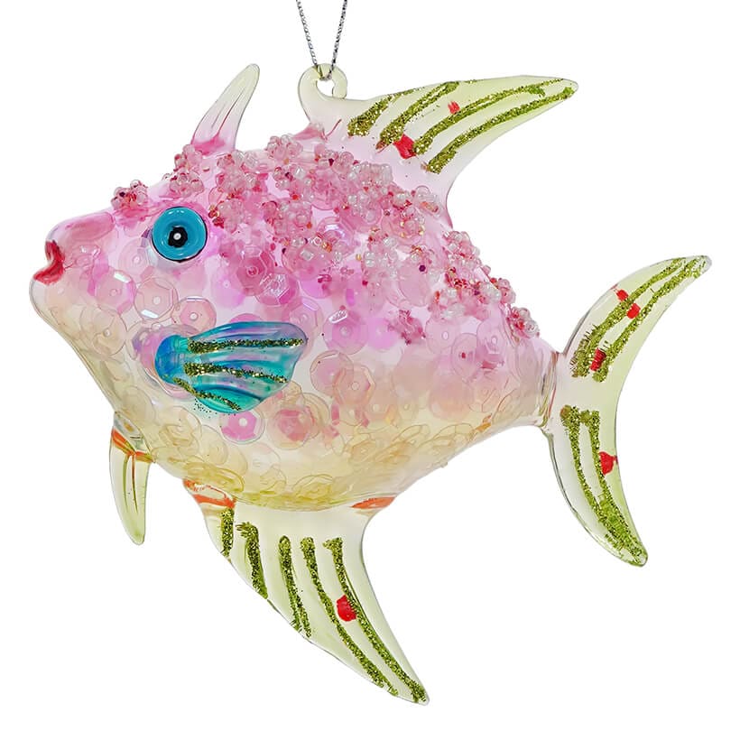 This fish has clearly never heard of camouflage and we doubt it would be interested if it had !With glimmering scales, glitter-tipped fins, and a body full of beaded flair, the Pink Glitzy Fish Ornament lives its life on full display. Measuring 1.5 by 4.25 inches, this glass ornament might be small, but it’s anything but shy.