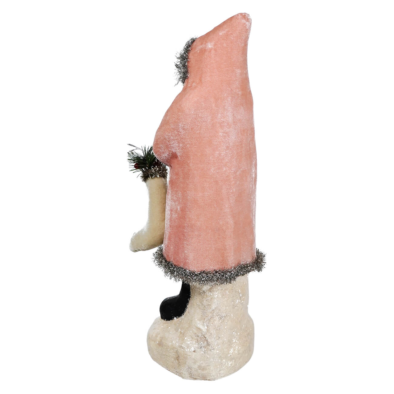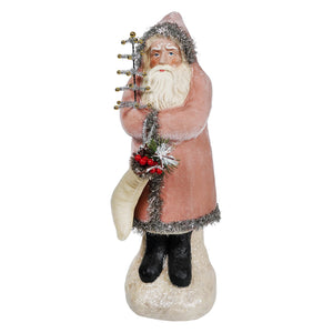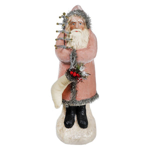This Pink Velvet Belsnickle brings a refreshing departure from the norm with its soft pink velvet coat adorned with a luxurious tinsel trim. The texture is so soft to the touch that you may find it hard to resist holding onto this charming Santa. Dressed in style, his white stocking overflows with festive pine and holly, creating a picturesque scene of holiday abundance.