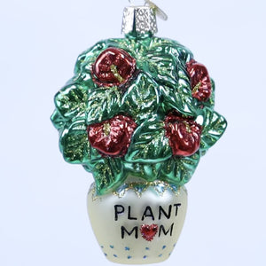 The Plant Mom ornament by Old World Christmas captures that love perfectly. A full, leafy green plant spills over with glossy texture, dotted with bright red blooms that add just the right pop of color. The gold pot below is simple but charming, finished with the sweet “Plant Mom” message that makes it feel personal in an instant. As a glass and glitter ornament, it catches the light beautifully, giving those rich greens and reds a soft shimmer on the tree.