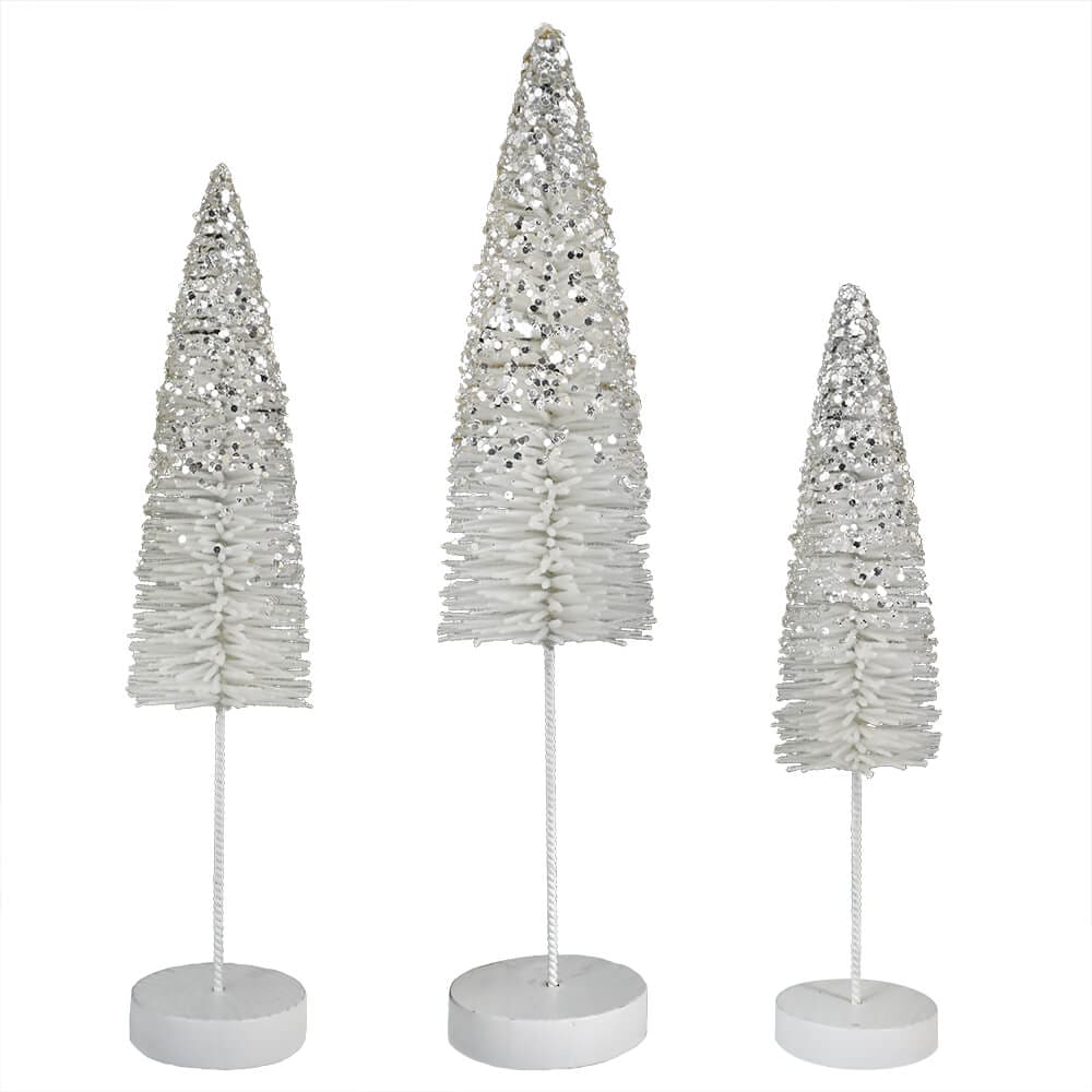 Platinum Glitter Flocked Bottle Brush Trees Set/3