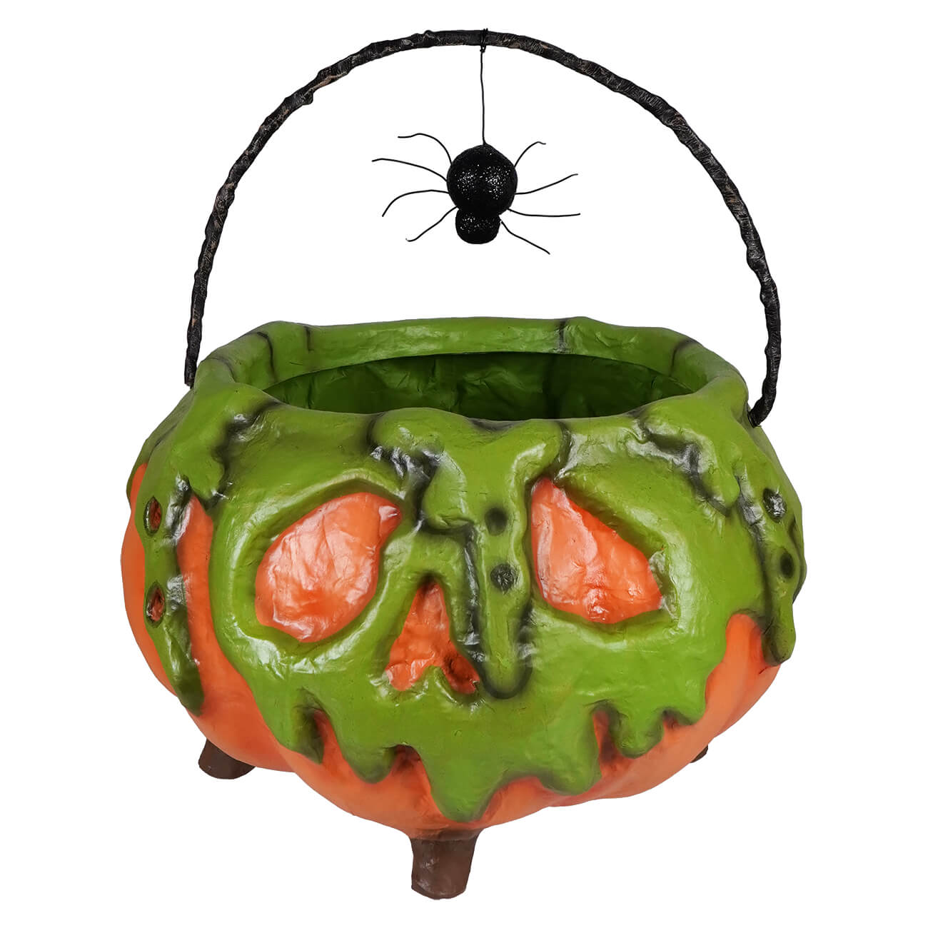 Dangling from the handle is a sneaky little spider, keeping watch over the cauldron’s creepy concoction. Whether it’s a potion, a curse, or just some really bad leftovers, this pumpkin’s contents are sure to keep your guests guessing.
