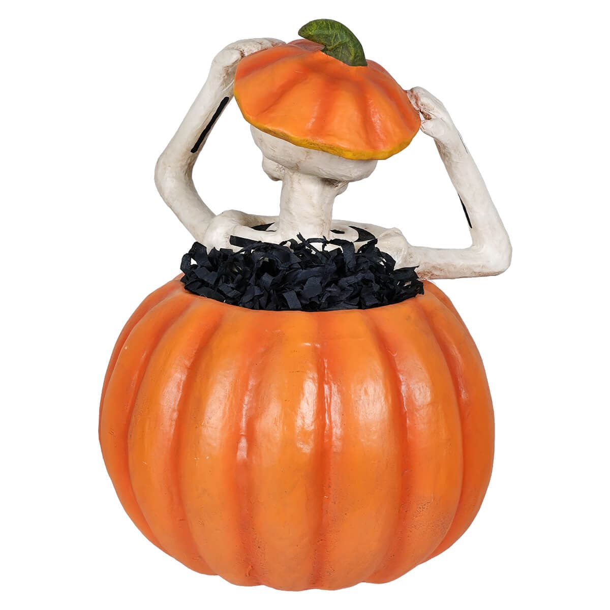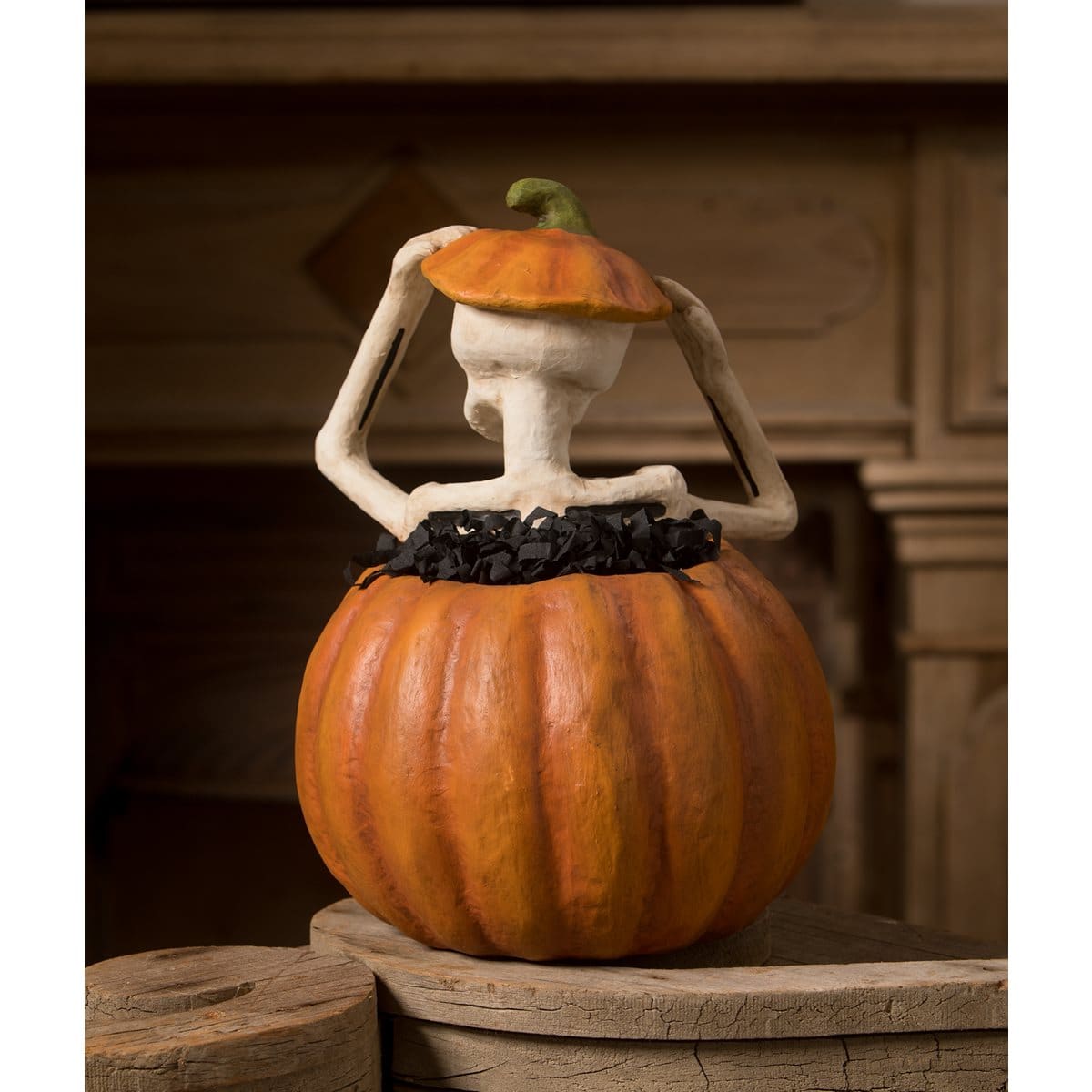 Standing at 14 inches tall, this paper mache figure is a delightful blend of playfulness and Halloween spirit. Featuring a mischievous skeleton bursting out of a cheerful jack o' lantern. The one piece Pop Up Skelly adds a touch of charm to your spooky festivities. With an infectious sense of fun, this skeletal character appears to be eagerly preparing to hide inside the pumpkin, ready to surprise the next person to cross its path. The Pop Up Skelly brings a vibrant and lively vibe to your Halloween display. The skeleton's joyful expression and lively pose exude a sense of casual fun, creating an atmosphere of easy going fun rather than fright.