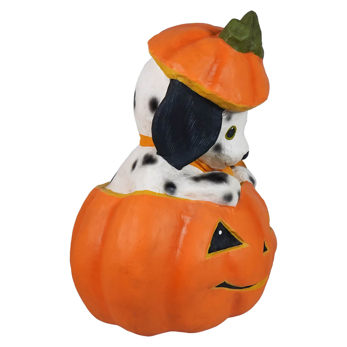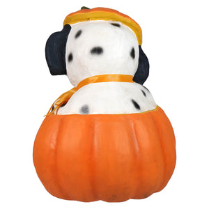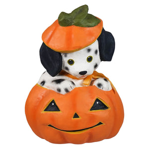 Crafted by Bethany Lowe, this delightful décor piece combines classic Halloween vibes with irresistible canine cuteness. Poppy's sweet expression, detailed black-and-white spots, and floppy ears make her a heart-melting addition to your seasonal display. Meanwhile, the pumpkin’s toothy grin adds just the right dose of spooky cheer.