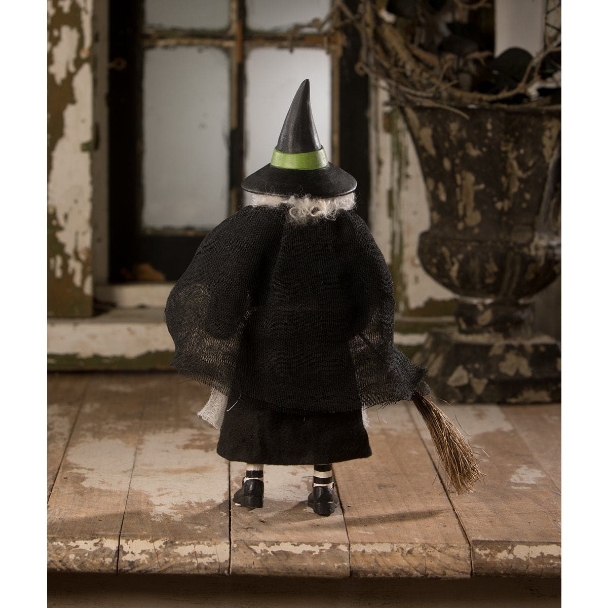 Dressed in a simple black dress with a white apron, she embodies the quintessential image of a classic witch. Her buckled shoes and iconic witch hat complete her timeless ensemble, adding a touch of nostalgic style to her character. Created with great attention to detail, this witch figure is made from a combination of hand painted resin and fabric clothing. The intricate design of her features and clothing showcases the artistry and craftsmanship behind her creation. In her hand, she holds a broom made from natural grass, and a skeleton key hangs from her hip, hinting at the mysteries she holds and still has access too, in case anyone should ask!