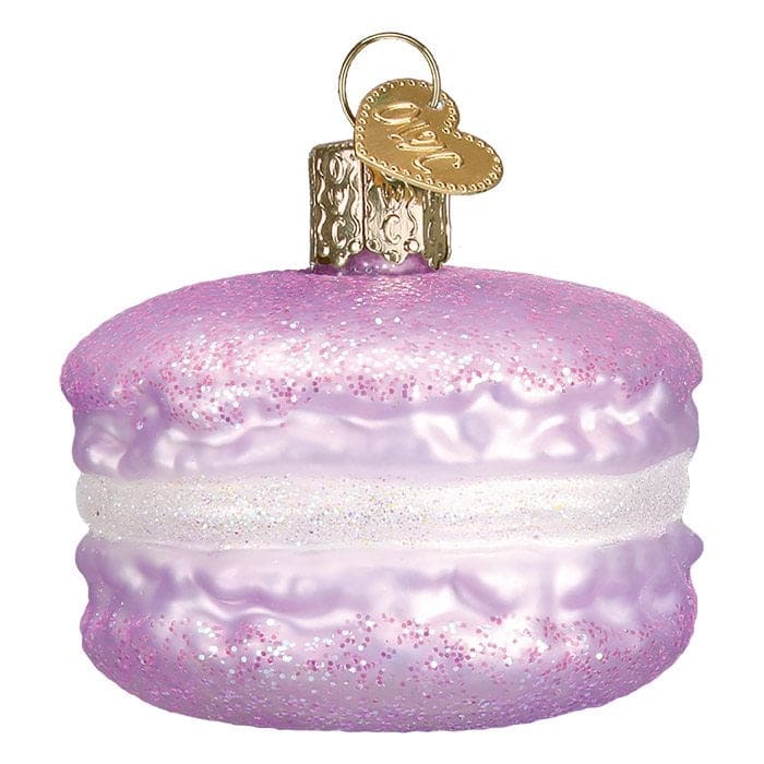 This Pink Macaroon Ornament is a glass decoration crafted to resemble the well-known French confection. It has a brilliant pink finish in a pastel hue, measuring 2.25 inches. While the center is accented with a band of fine glitter, creating the effect of a sugary cream filling. The rough surface resembles the ridges of a conventional macaroon.