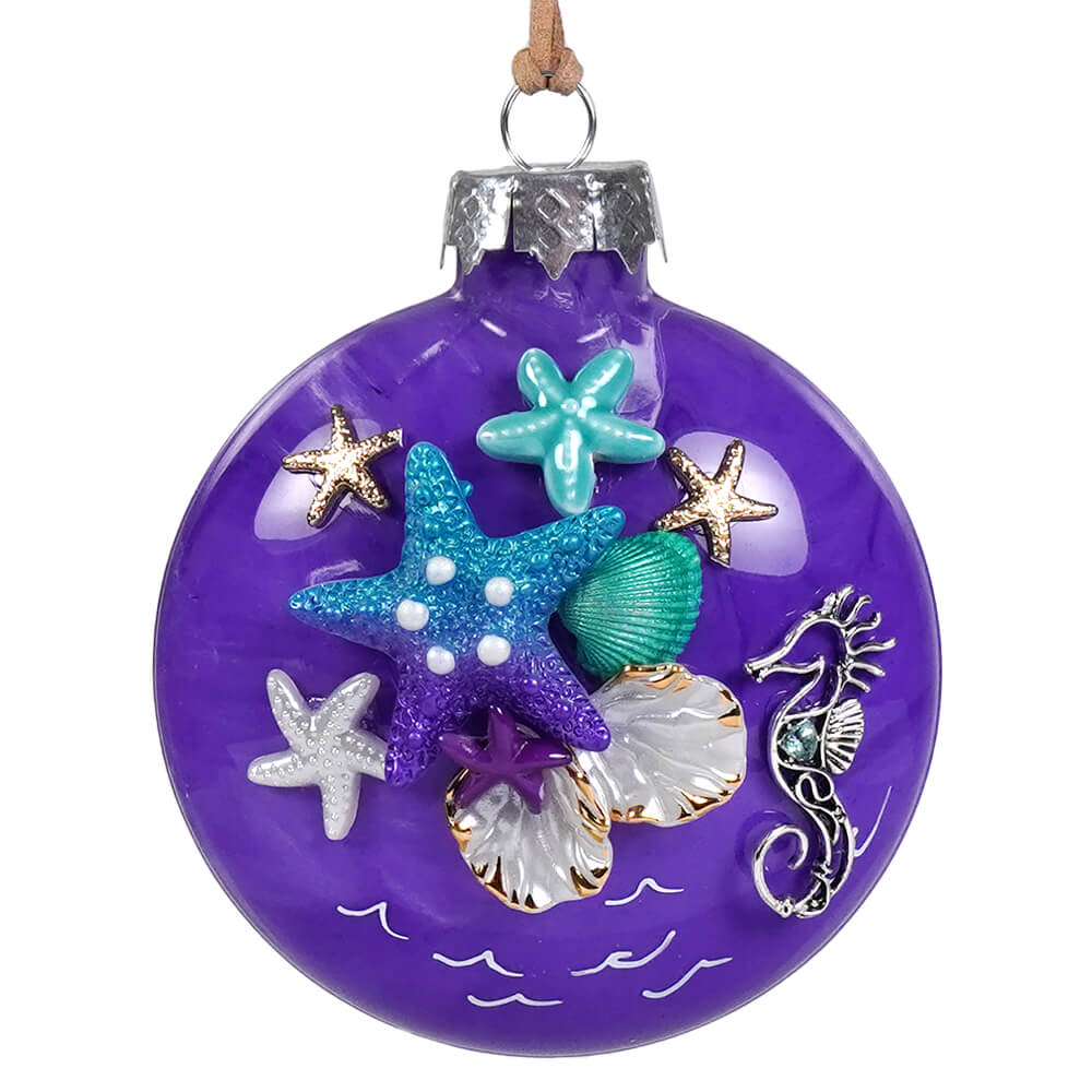 Make a splash with royal flair this season with the Purple Seahorse & Starfish Ornament by Bette Fraser Day—a deep-sea dazzler that proves even marine life knows how to dress for the holidays. This rich purple bauble is teeming with ocean elegance, featuring graceful seahorses, stylish starfish, and perfectly posed seashells that look straight out of a beachside fashion show.