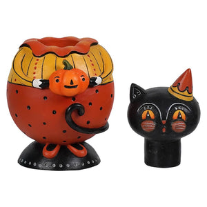 Pop open the top of the delightful Purscilla Spooks Jar and let the Halloween festivities begin! At 6.5 inches tall, this resin jar is the latest sensation from Johanna Parker's collection of Spook Jars. Purscilla is ready to attend the Halloween gala, donned in her festive orange and yellow party outfit, complete with a pointy party hat.