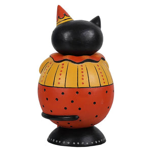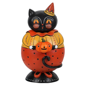 A purrfect addition to to collection of Spook Jars by Johanna Parker, Purscilla is looking plump and pretty in her orange and yellow Halloween party outfit. Her whimsical tail curls around her lower half and her surprised face looks as round as the smiling jack o' lantern she holds. The best part is you can open her up from the middle to hide some Halloween treats inside!