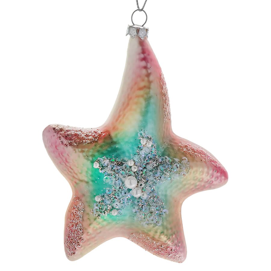 The ornament's surface has raised bumps that mimic the texture of a starfish, and its glinting embellishments and color gradients give it a unique ornamental flair. With this colorful creature, you can add a vibrant blend of texture and sparkle to your pastel collection or go all out for a beachy vacation style.