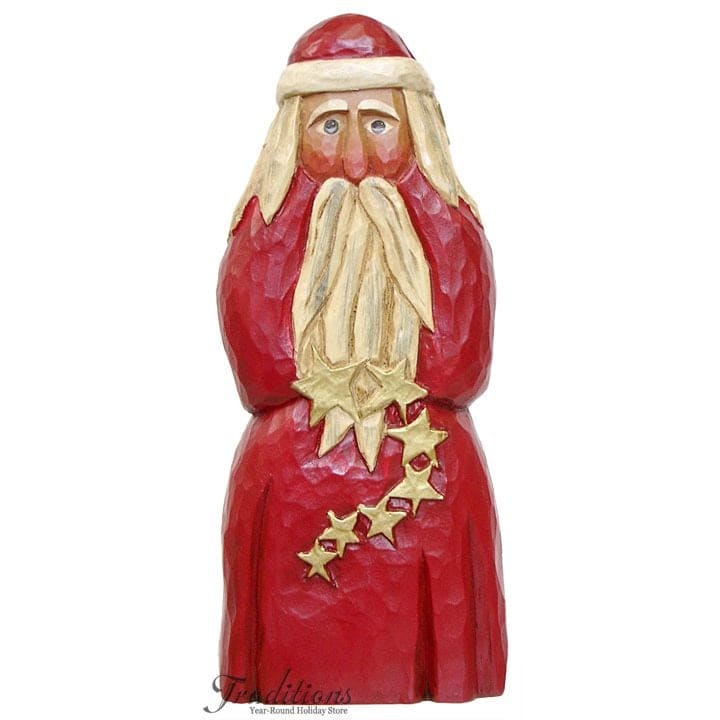 As the holiday season fills our hearts and hearts with warmth, the Red Star Garland Santa stands as a festive sentinel of the season's joy and merriment. This 7.5-inch resin figure, designed by Lori Miller, is a handsome addition to any holiday collection, featuring a cascade of golden stars adorning his rich red coat.
