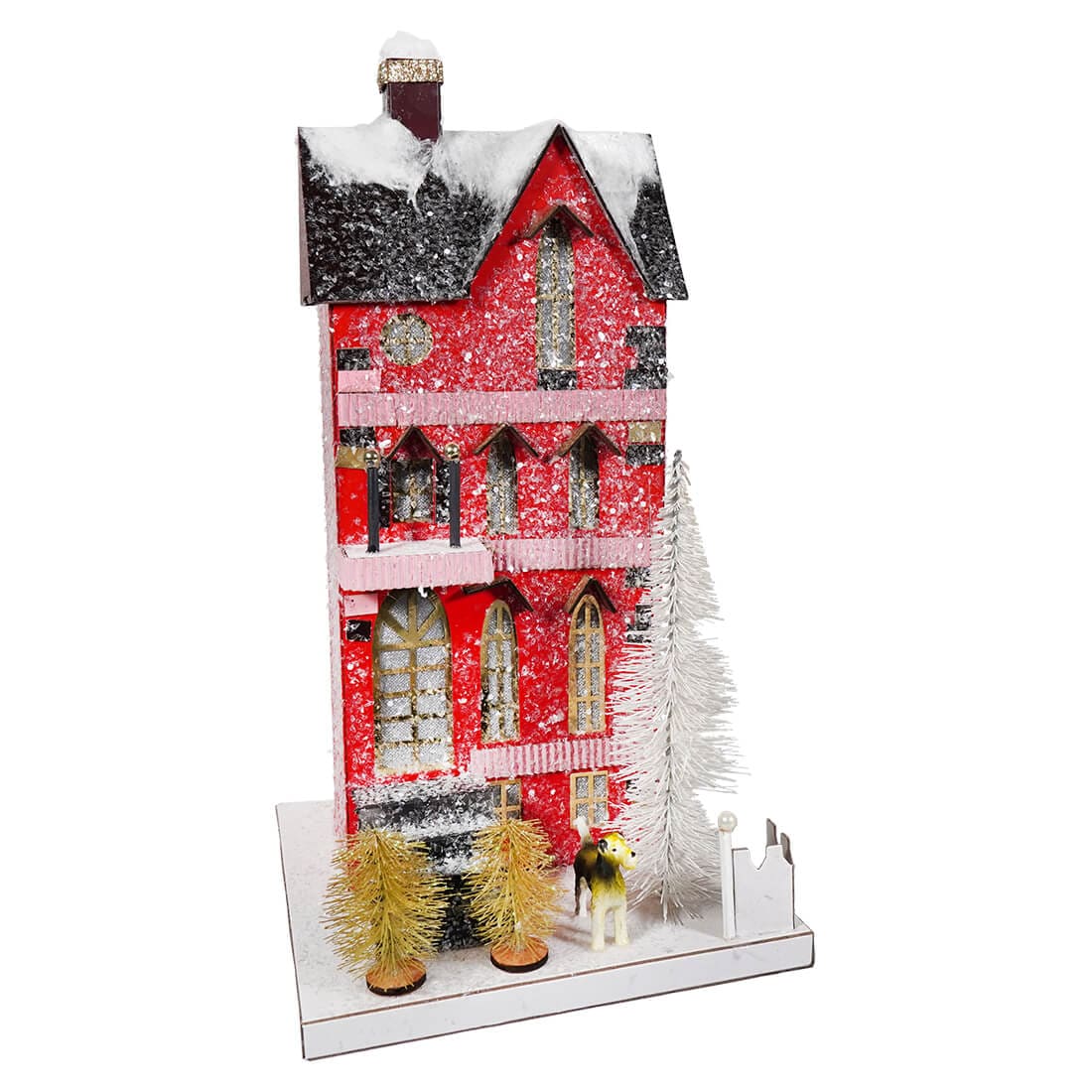 The Merry in Red Townhouse, a delightful creation by Cody Foster Design, embodies the essence of a traditional Christmas village scene. Crafted from paper pulp, bottle brush, glitter, and mica, this townhouse stands at a size of 9x9x16 inches, making it a substantial and eye-catching addition to your holiday decor.