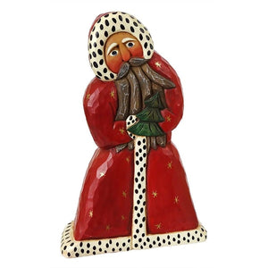 This figure’s stout, rounded form gives him a sturdy and grounded appearance, and his hooded coat with its high-contrast spotted lining brings a touch of elegance to his otherwise simple, rustic aesthetic. The bold red and deep green of the tree pop beautifully, making this Santa a standout piece in any holiday decor.