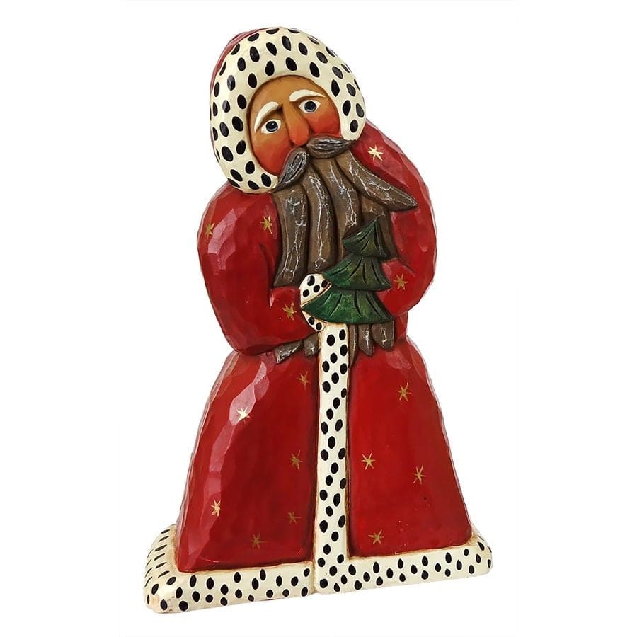 Santa has taken on a cozy woodland look in this Lori Miller-designed Red Woodland Santa from the Whispering Pines Carving Collection. Standing 9 inches tall, this resin figure combines traditional holiday themes with rustic, outdoor-inspired details.