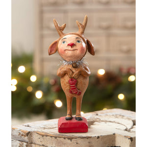 Standing sweetly on his bright red base, Reindeer Boy features a shy little smile, rosy cheeks, and classic reindeer antlers. He holds a tiny red stocking with pride, ready to celebrate the magic of the season. His vintage-style finish, hand-painted details, and silver tinsel collar make him a standout piece for collectors and holiday decorators alike.