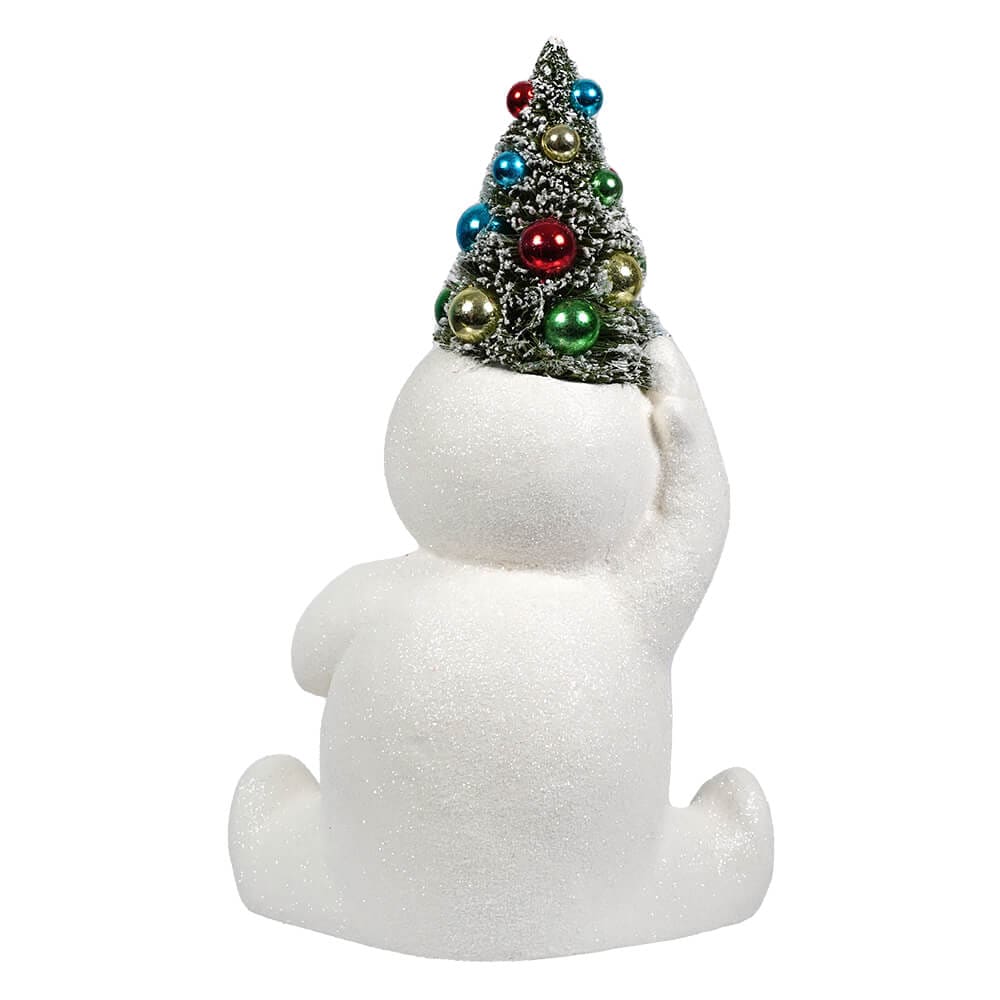 Decked out with a glistening Christmas tree on his head adorned with colorful baubles, this snowman is a nod to the retro styles of the season. His coal-black eyes, curved in a friendly twinkle, pair with a quaint, carrot-like nose that points merrily outwards, as if indicating the direction to the nearest holiday party.