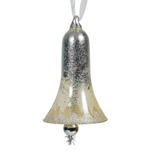 Transport yourself to a bygone era of mid-century glam with this bell ornament that oozes vintage charm. The bell's clear glass, sporting a delightful gold tint, takes you on a trip down memory lane, reminiscent of cozy living rooms aglow with tinsel and charm.