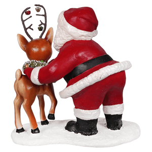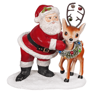 The Retro Santa With Reindeer by Bethany Lowe Designs brings the nostalgic sparkle of mid-century Christmas décor right to your tabletop. Standing proudly beside his festive young reindeer companion, Santa looks ready to lead the parade of holiday cheer. The jolly old elf is dressed in his signature red suit, trimmed with soft white fur, his face beaming with warmth and timeless merriment. Beside him, a sweet reindeer gazes up with trusting eyes, its antlers playfully adorned with colorful ornaments and a lush green wreath draped around its neck—because even reindeer deserve to be properly accessorized for the season.