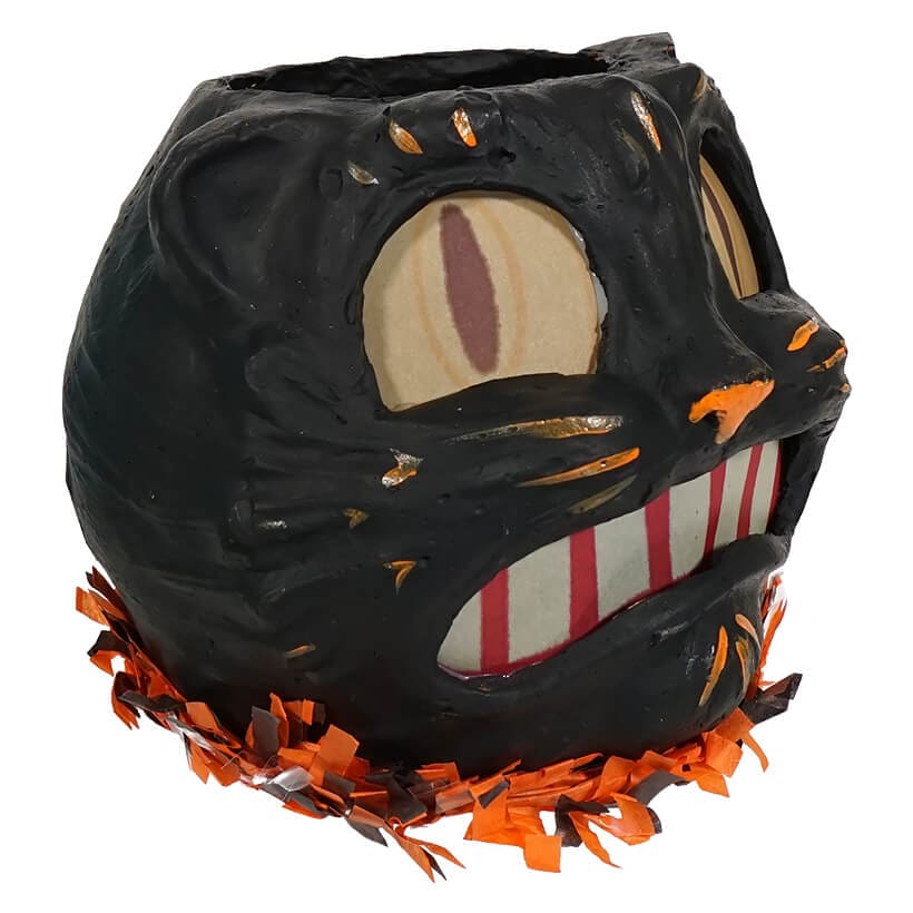 The Retro Scaredy Cat is here to prowl your Halloween collection with that classic, wide-eyed expression of surprise that never gets old. This little 6-inch paper mache lantern by Rachel Garrison captures the spirit of vintage Halloween decor with its dramatic features and unmistakable old-school vibes.