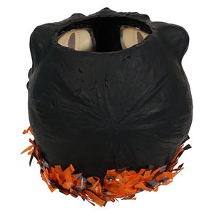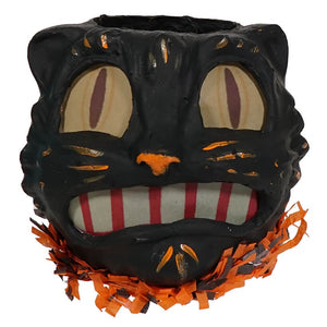 Around the base, a ring of crinkled orange and black crepe festooning gives this black cat a burst of old-fashioned flair, perfect for a Halloween display that leans into those spooky retro roots. The wide, toothy grin, framed with bold red and white stripes, adds a bit of playful fear, as if this cat just spotted a ghost or perhaps caught a glimpse of its own shadow.