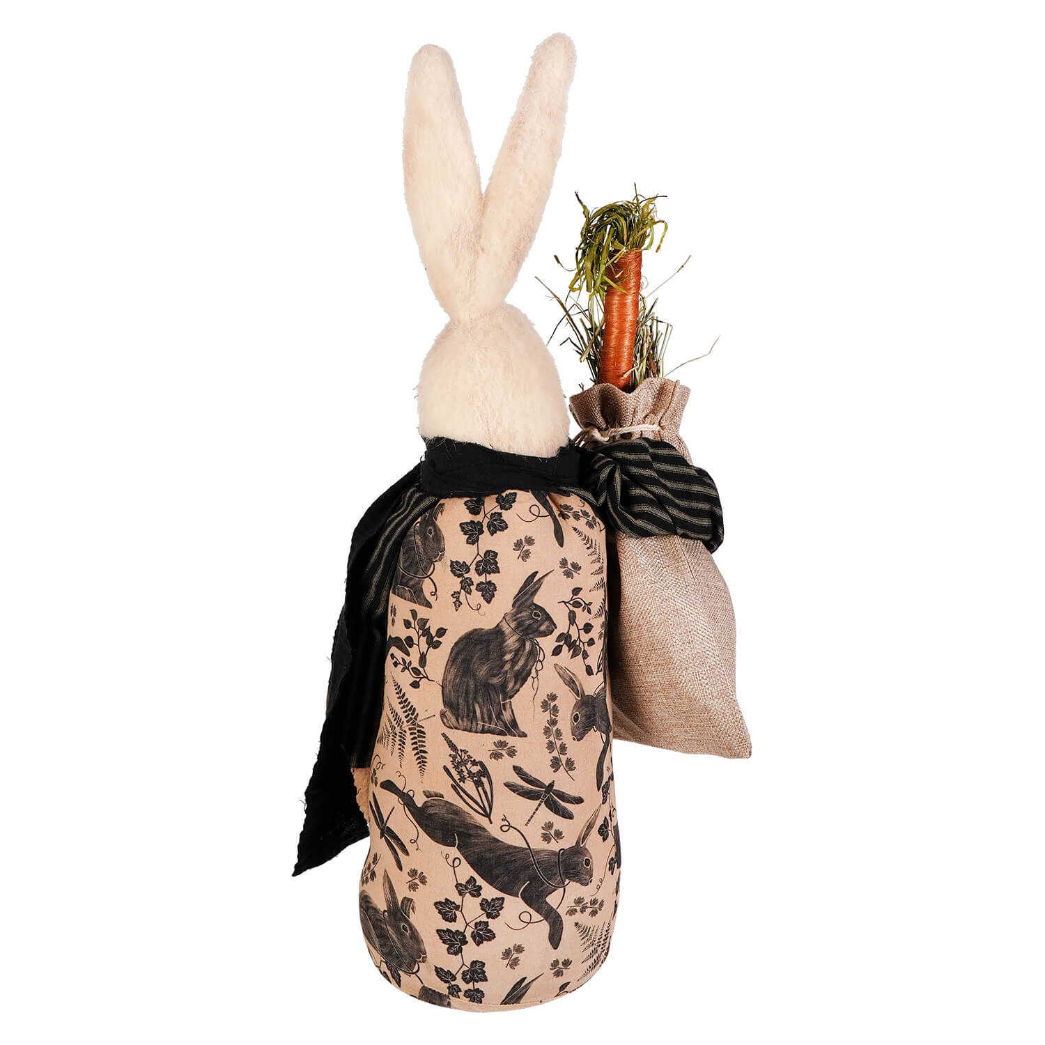 Robin Rabbit isn’t here for fanfare—he’s here with a full sack and somewhere to be. At 22 inches tall, this rabbit figure keeps things practical and grounded. One paw holds a burlap bag packed with straw and wild greens, tied at the top like it was just pulled from a garden shed. His expression is stitched into a simple, straight-to-the-point face—no smile, no flair, just the quiet focus of someone who’s used to getting things done.