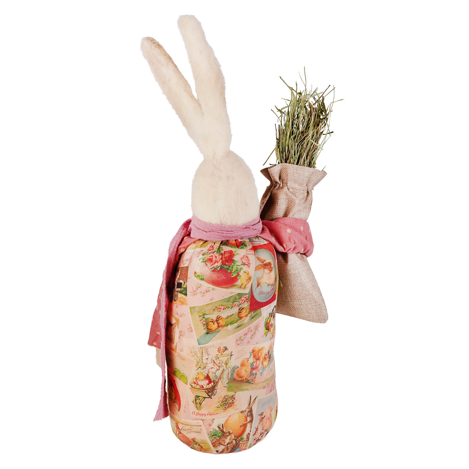 The soft-toned vintage images on her cloth body, which include bunnies, baskets, and scenes from spring, are layered in delicate colors and resemble old Easter cards. In order to break up the muted tones, she wears polka-dot sleeves with a pink scarf around her neck. One wooden button is stitched onto the front, slightly off-center and barely holding on, but it suits her just fine.