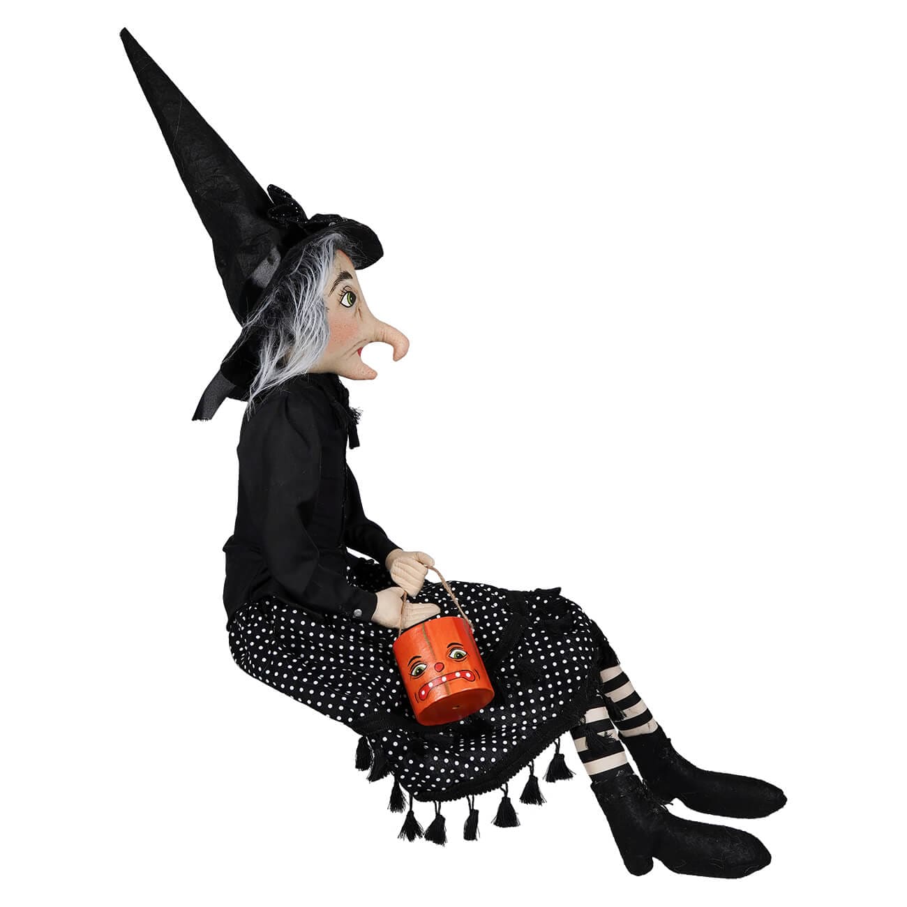 Rowena's black top, adorned with shimmering silver buttons, flatters her form-fitting curves and perfectly complements her black and white polka dot skirt, accentuated with a trim of playful black fringe. Her outfit is completed by black and white striped stockings and a classic black witch hat that covers her greying hair, adding a touch of mystery to her bewitching appearance. To carry her magical essentials, Rowena brings along a charming pumpkin bucket purse, the perfect accessory to complete her ensemble with a whimsical flair.