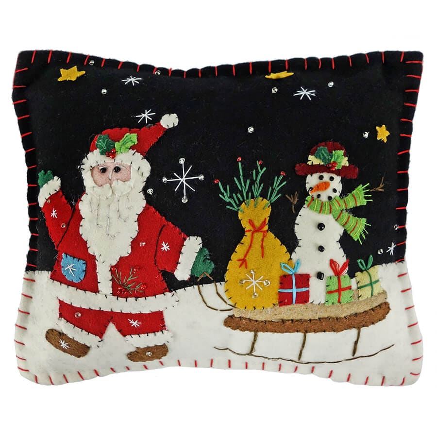 Get ready to sleigh the holiday décor game with the Santa Pulling Snowman On Sled Pillow by New World. This hand-stitched wool felt masterpiece features Santa working off those cookie calories, hauling a sled packed with a jolly snowman and presents—because even Santa knows teamwork makes the dream work.