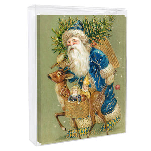 Santa's holiday adventure comes to life with the Santa & Reindeer Set of 5 Greeting Cards, a nostalgic nod to timeless Christmas magic. This heartwarming design features Santa Claus in a deep blue suit, carrying a bag full of toys and holiday cheer. Accompanied by a loyal reindeer and festive companions, Santa is ready to spread joy to all who are near. The intricate details of the evergreen trees, toys, and warm winter textures evoke the true spirit of Christmas.