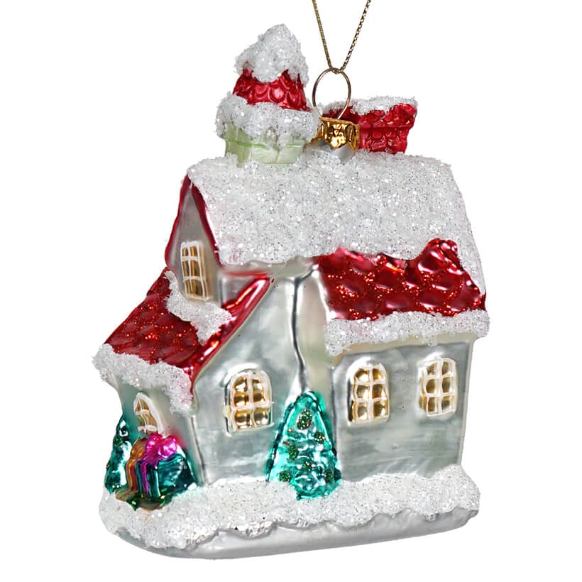 This charming glass ornament recreates Santa's own home in whimsical detail, capturing the essence of the jolly old elf himself. The roof is adorned with a glistening layer of mica snow and glitter, creating a scene that's reminiscent of a winter wonderland.