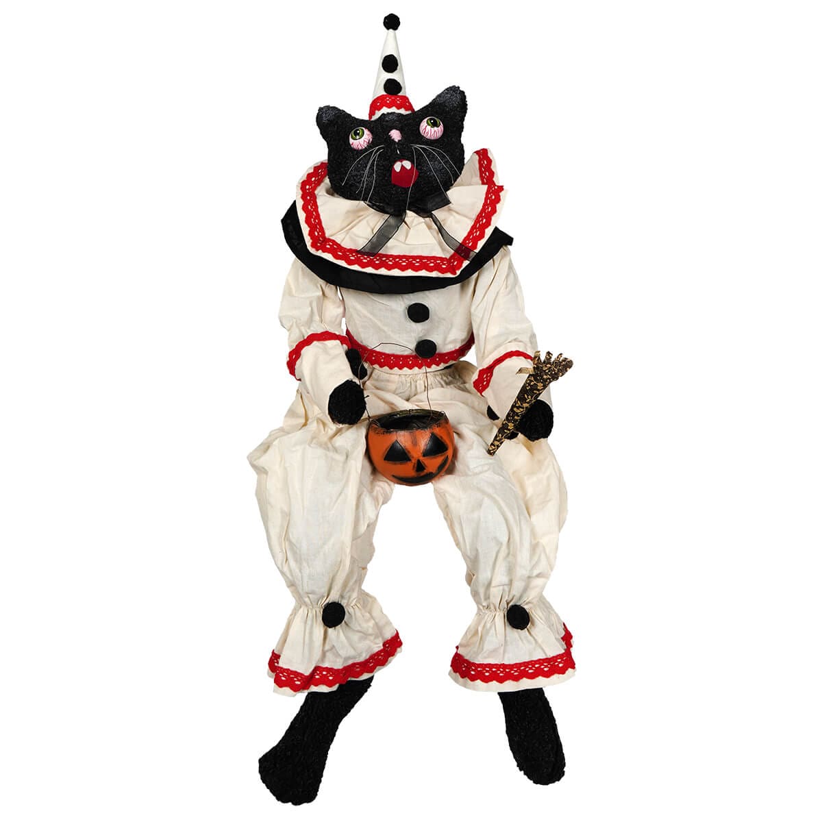 Sebastian sits for a brief moment of respite in his clown costume, candy bucket, and noisemaker in hand. The Sebastian Figure is a standout piece, seamlessly fitting into both Halloween clown figure collections and black cat collections. With his unique combination of a mischievous black cat and a spooky clown, Sebastian brings a playful yet eerie vibe to your Halloween decor.