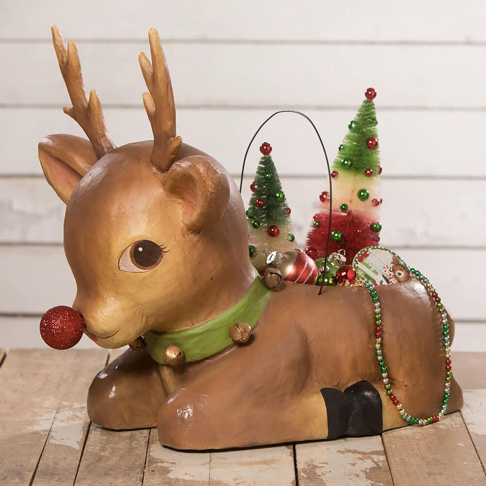 Even Rudolph gets a day off! This Shining Bright Rudy has an opening in his back that is perfect for holding your holiday goodies or a festive arrangement. Rudy's famous red nose sparkles with red glitter and his green collar rings with it's adorning gold jingle bells. This paper mache reindeer has such a great retro appeal and fits right in with any of the other Bethany Lowe reindeer in your collection!