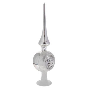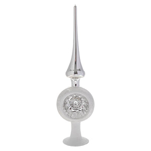 Sparkles of light reflect off the shiny silver reflector on this silver finial tree topper, as well as the white glitter rings and white filigree around the indent. While it looks fantastic on top of a silver and gold themed Christmas tree or feather tree, the flat base covered in white glitter allows it to stand upright on a mantel or tabletop as well.