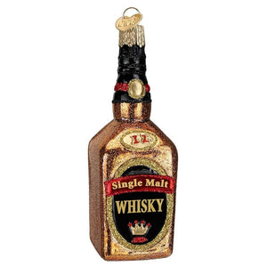This Single Malt Whiskey Bottle Ornament hails straight from the rich traditions of Celtic heritage, encapsulating the robust essence of the ""water of life"" as the Gaelic forebears named it. At 4.25 inches, this glass decoration from Old World Christmas is an accurate miniature of a cherished whiskey bottle, with a detailed label and a glistening brown glass that mimics the warm hue of whiskey aged to perfection.