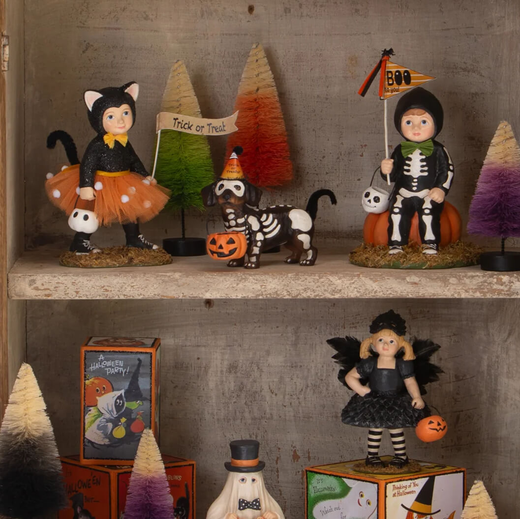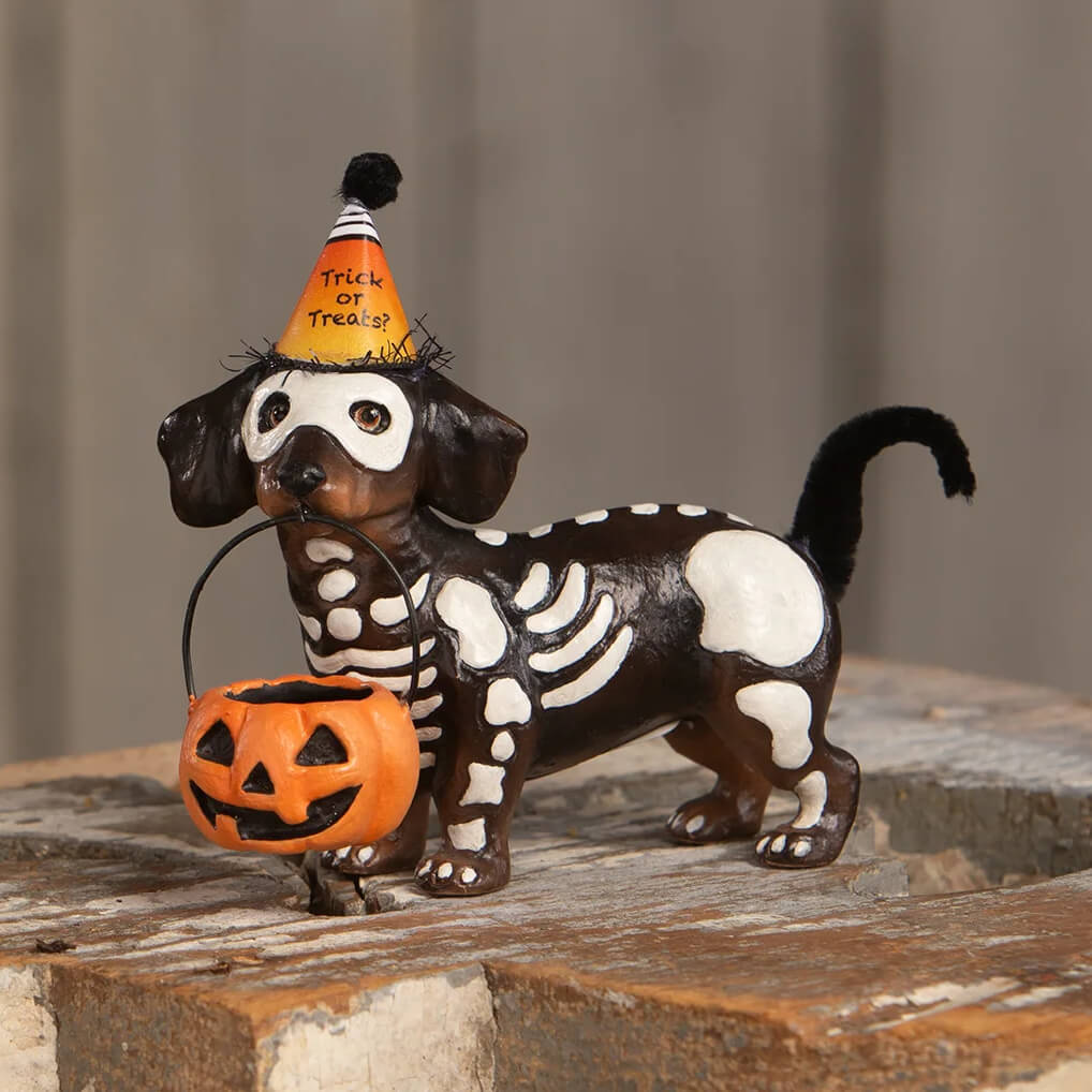 The Skeleton Pup Table Piece by Bethany Lowe is an adorable dachshund fully dressed in a skeleton costume, complete with a white mask and an orange party hat that says "trick or treats." Of course, no pup would be caught without their pumpkin bucket, which this dog proudly holds in its mouth, all set for candy duty.